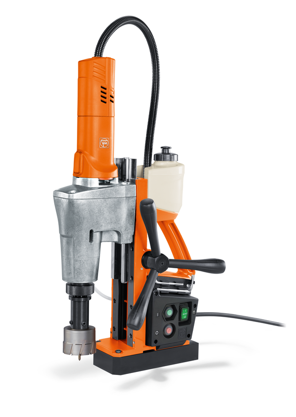 2-biegowa magnetyczna wiertarka rdzeniowa Eco o dużej mocy i dużym zakresie skoku, uchwyt narzędziowy MK3, głębokość cięcia 75 mm, podstawowe funkcje do wiercenia rdzeniowego i pełnego w warsztacie i na budowie.